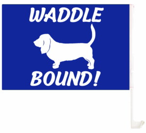 NEW this year, we have a limited edition “Waddle Bound!” car flag that clips onto your car window. The flag features a classic basset hound silhouette on a bold blue background and is the perfect way to show your basset pride while traveling to the BoardWaddle events and beyond.