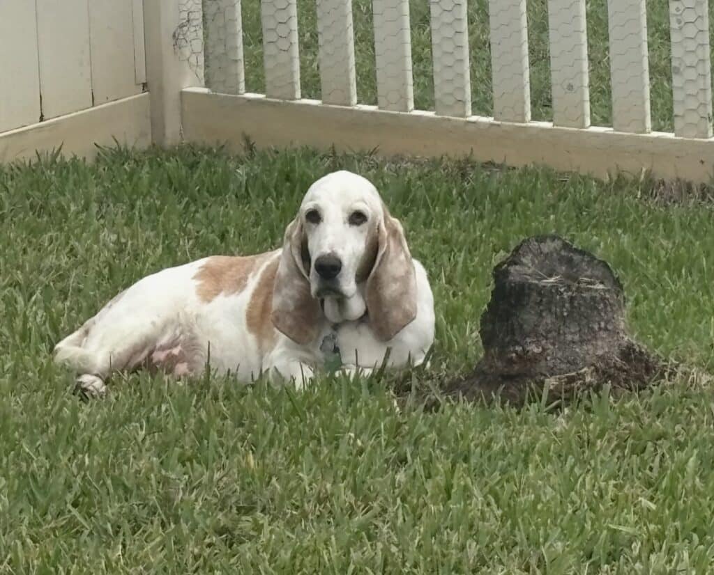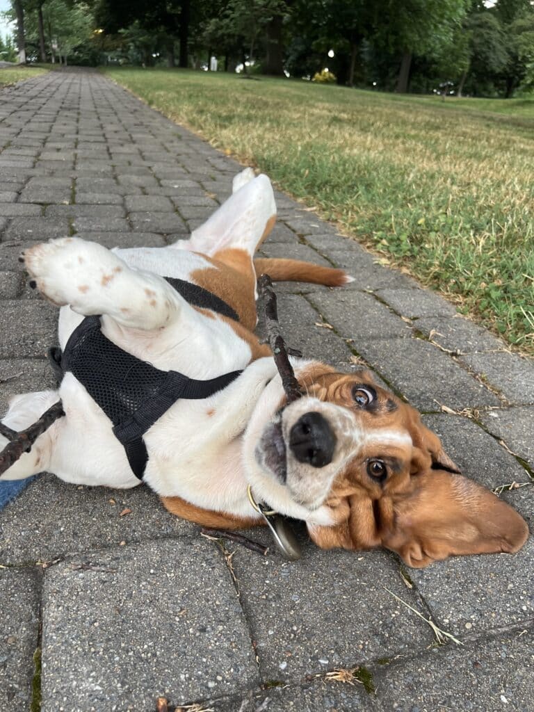 We picked up Joon at a Wawa in December 2022 when she rode up on the doggie bus from Alabama to Baltimore. We were so excited as the volunteers brought her off the van: watching her short (but long for a basset!) legs trot along in the cold parking lot was a sign of many good walks yet to come.